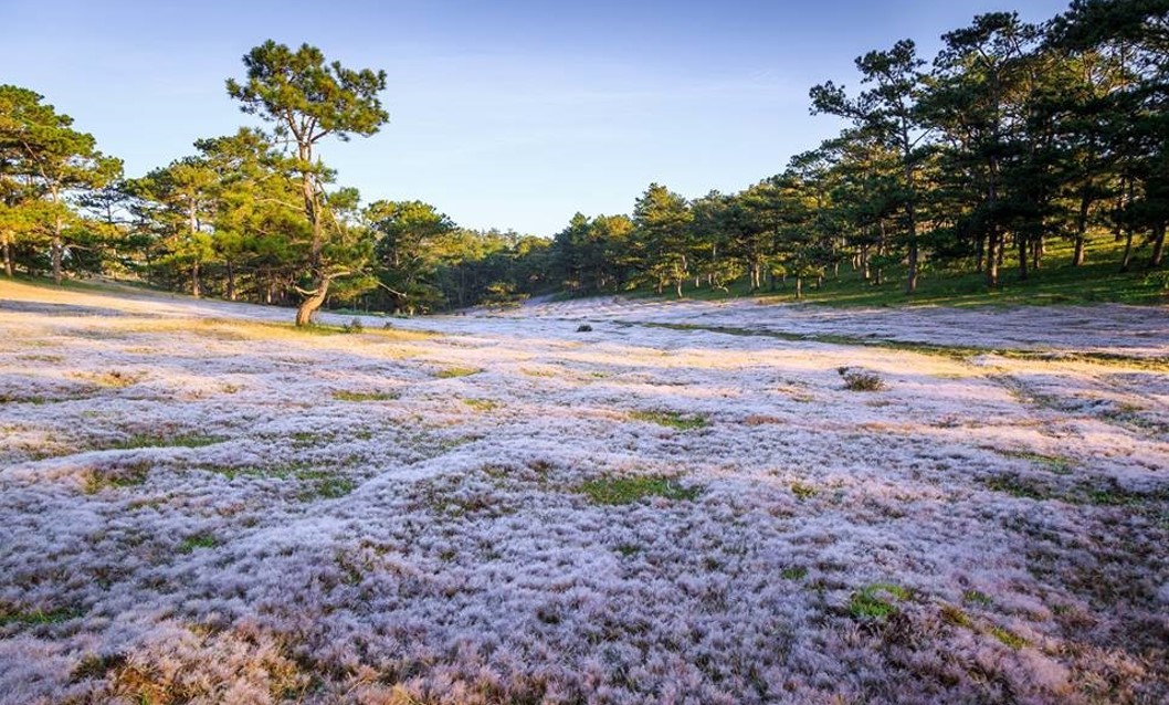Khi có sương (Cỏ Tuyết): Những giọt sương li ti bám dày trên cánh cỏ khiến cả cánh đồng trắng xóa như được phủ một lớp tuyết mỏng của vùng ôn đới.