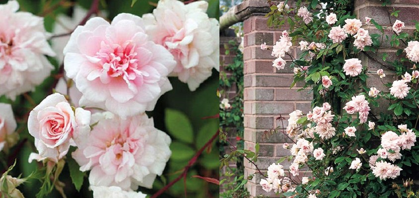 9. 'Cecile Brunner Cl': Phiên bản leo của giống 'Cecile Brunner', hoa nhỏ nhắn, đáng yêu, màu hồng phớt nhẹ nhàng, nở thành chùm, phù hợp cho những giàn leo nhỏ, cổng vòm