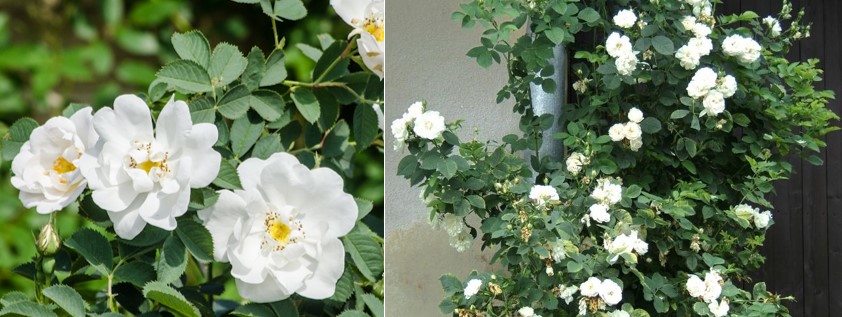 6. 'Sally Holmes': Hoa màu trắng kem, bụi cao và vươn rộng. 'Sally Holmes' là một giống hoa hồng Shrub cao lớn, có thể đạt chiều cao trên 2m. Hoa có màu trắng kem nhẹ nhàng, hoa bán kép nở thành chùm lớn, tạo nên vẻ đẹp thanh thoát và duyên dáng. Bụi cây khỏe mạnh và ít gai