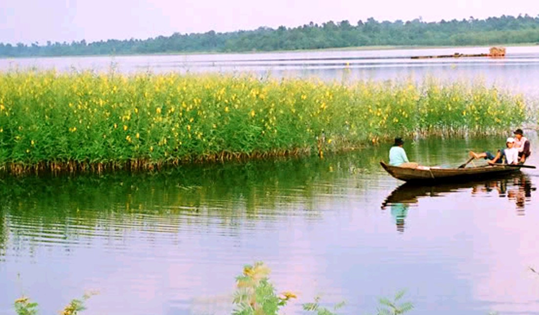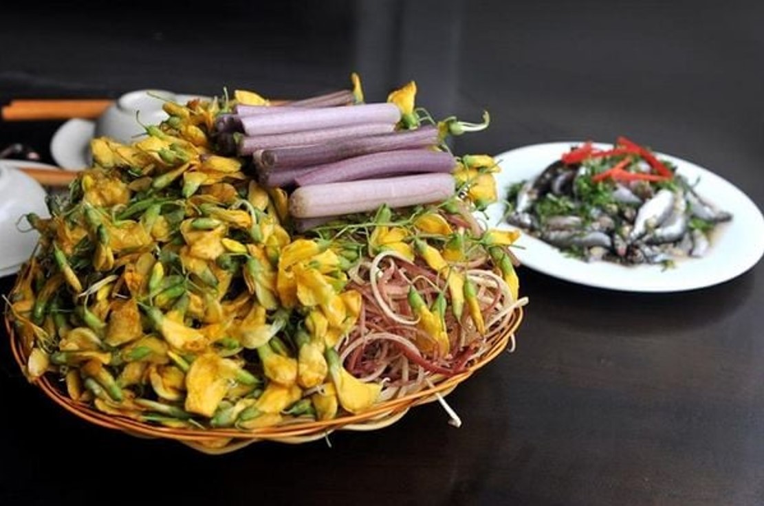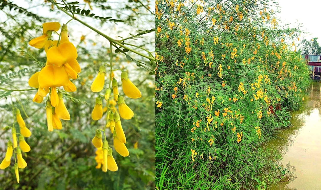 Cây điên điển là cây thân gỗ nhỏ hoặc cây bụi, có khả năng sống tốt ở vùng đất ngập nước, đầm lầy, ven sông, kênh rạch. Hoa điên điển có màu vàng tươi rực rỡ, khi gặp nắng càng trở nên lộng lẫy, chói chang, tạo nên khung cảnh vàng rực khắp các bờ kênh, đồng ruộng. Hoa mọc thành từng chùm ở đầu cành, cánh hoa mỏng manh, mềm mại, có hình dáng gần giống hoa đậu, vị nhân nhẫn (đắng nhẹ) đặc trưng, sau đó là vị ngọt, giòn và bùi béo, là loại rau sạch được ưa chuộng.