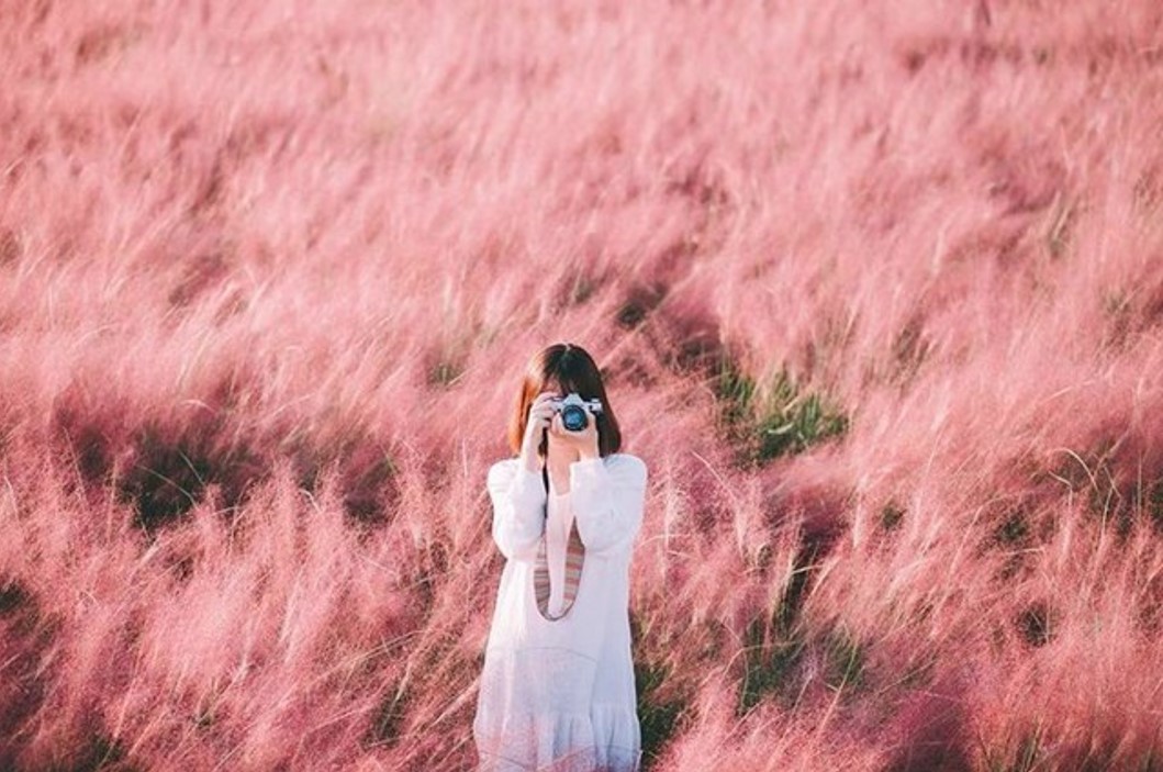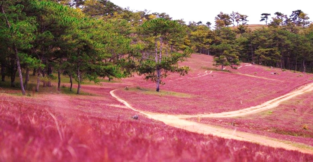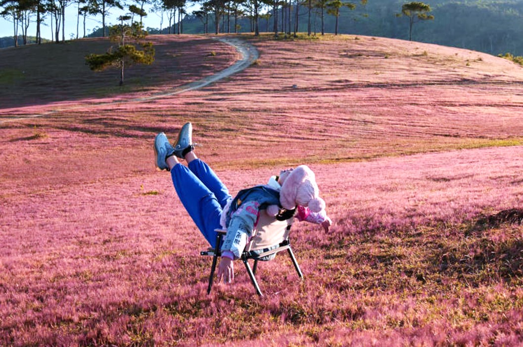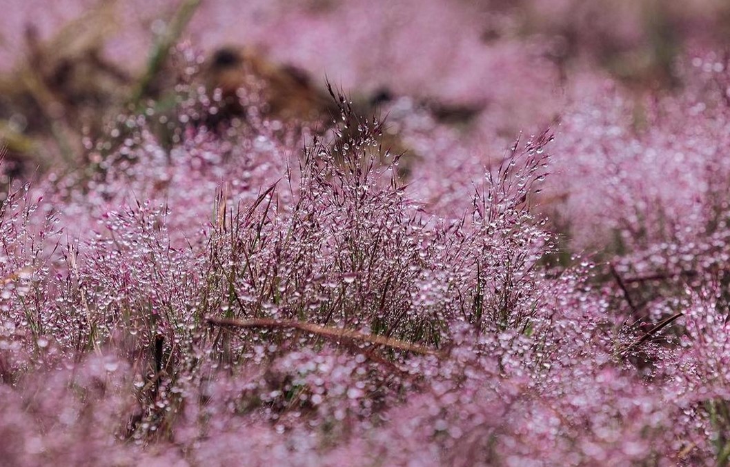 Khi nắng lên (Cỏ Hồng): Ánh mặt trời xuyên qua các giọt sương, làm lộ ra sắc hồng tím nhẹ nhàng, biến đồi cỏ thành một tấm thảm nhung bồng bềnh và ấm áp.