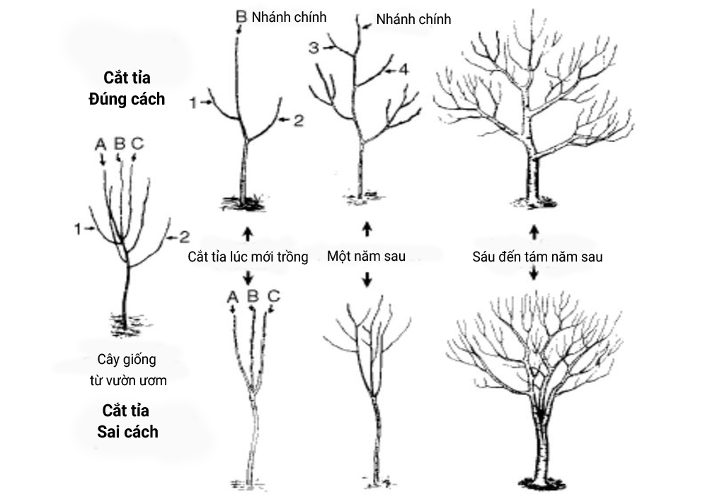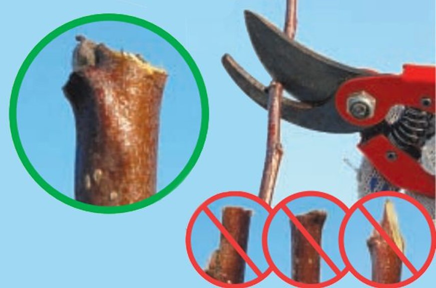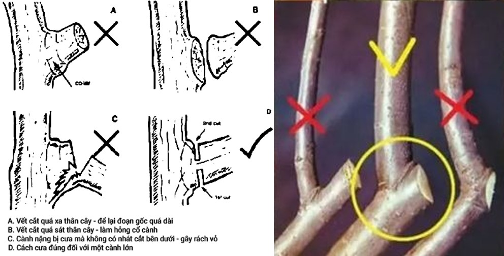 + Không để lại phần gốc quá dài: Nếu để lại một đoạn cành thừa, đoạn đó sẽ bị thối rữa vì không có nhựa nuôi, tạo đường cho vi khuẩn đi vào thân chính.
