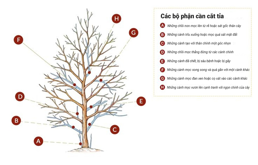 + Dead (Chết): Loại bỏ cành chết để tránh mục nát và tạo không gian cho cành mới.